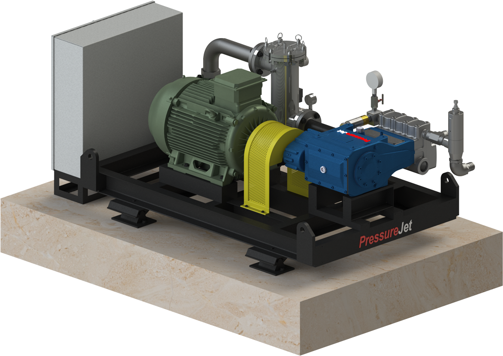 Electric Motor or Diesel Engine Driven Hydro Test System with Pressure Range from 135 to 300 Bar with Flow rate Range 110 LPM to 211 LPM . Motor HP is between 75-110 HP